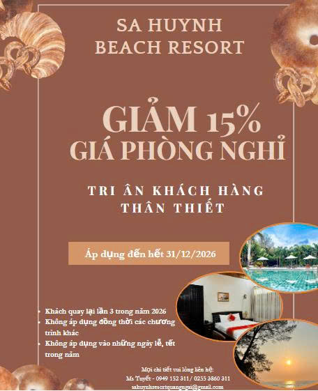 Như một lời cảm ơn chân thành đến Quý khách đã luôn tin tưởng và đồng hành, Sa Huynh Beach Resort xin gửi tặng ưu đãi đặc biệt (Áp dụng đối với Phòng nghỉ):