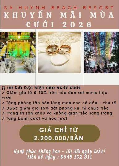 Ngày cưới là khoảnh khắc thiêng liêng và đáng nhớ nhất trong cuộc đời. Hãy để 𝐒𝐚 𝐇𝐮𝐲̀𝐧𝐡 𝐁𝐞𝐚𝐜𝐡 𝐑𝐞𝐬𝐨𝐫𝐭 cùng bạn tạo nên một lễ cưới lãng mạn bên bờ biển, sang trọng và trọn vẹn cảm xúc. 𝐔̛𝐔 Đ𝐀̃𝐈 Đ𝐀̣̆𝐂 𝐁𝐈𝐄̣̂𝐓 𝐂𝐇𝐎 𝐍𝐆𝐀̀𝐘 𝐂𝐔̛𝐎̛́𝐈 Giảm giá từ 5-10% trên hóa đơn set menu tiệc cưới Tặng phòng tân hôn lãng mạn cho cô dâu – chú rể Trang trí sân khấu và không gian tiệc sang trọng Tặng bánh cưới và hoa tươi Thực đơn đa dạng, chất lượng (có thể tùy chỉnh theo yêu cầu) Không gian cưới bên biển độc đáo, địa điểm lý tưởng để tổ chức tiệc cưới ngoài trời bên bờ biển Vô số góc chụp ảnh đẹp ngay trong khuôn viên resort